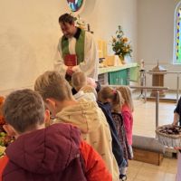 Zu Beginn trugen unsere Kindergottesdienst-Kinder Früchte und andere Gaben nacheinander durch den Mittelgang in den Altarraum und schmückten damit eine eigens dafür vorgesehene Bank.