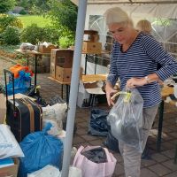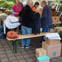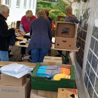 Nach einem Aufruf der Organisation "Humanitäre Hilfe Osteuropa e.V." trafen sich am 3. September 2025 einige Taller Gemeindeglieder unter dem Pavillon vor der Kirche, um unter der erfahrenen Anleitung von Almuth Müller aus der Bethlehemsgemeinde Hannover die gesammelten Hilfsgüter wie z.B. Bekleidung, Haushaltswaren und medizinische Artikel fachgerecht zu sortieren und zu verpacken. Ursprünglich war die Lieferung der Güter für die Ukraine geplant, werden jedoch aus Sicherheitsgründen nun doch wie früher schon einmal wieder nach Moldawien geschickt. (emri)