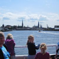 Am nächsten Tag und bei strahlendem Sonnenschein stand Lübeck mit seinen vielen Sehenswürdigkeiten auf dem Programm. Außerdem eine Schifffahrt auf der Trave bis Travemünde, vorbei am Segelschulschiff 'Passat' mit Rückblick auf das Stadtpanorama von Lübeck mit seinen vielen Kirchtürmen.
